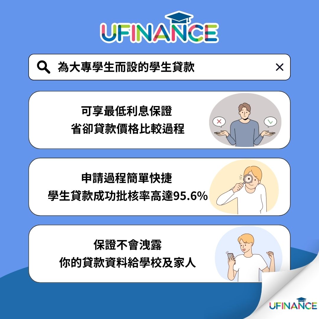 大專生很多時候急需資金周轉交學費,但政府學資處的貸款計劃又未能及時批核。因此,uFinance 根據過往同學們的良好還款紀錄,不斷簡化申請程序,申請只需「學生證+身份證」,申請成功率高達95%,全程網上快捷辦妥,貼合同學需要。